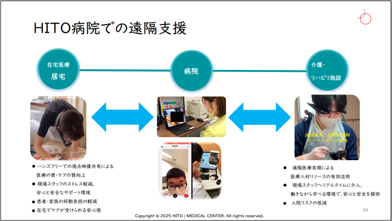 当院では、特定行為の研修を行っており、在宅ケアの特定行為ができる看護師が育ってきています。看護師が訪問の現場に出て、スマートグラスを活用しながら病院にいる専門職にアドバイスを受けながら対応しています。